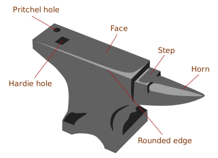 虽然铁砧的尺寸和长度在世界不同地区随时间而变化,但铁砧的标准设计包括砧角(horn)、砧面(face)、台阶(step)、冲孔(pritchel hole)和方孔(hardy hole)。