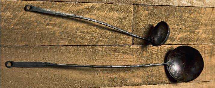 要组装和完成碗和长柄勺,在碗和手柄上钻两个略大于10号线的孔。使用10号铜线作为铆钉。对于蛋勺,弯曲手柄使其在以约30度角握持手柄时与碗保持水平。对于长柄勺,弯曲手柄以确保在以约80度角握持手柄时碗保持水平。