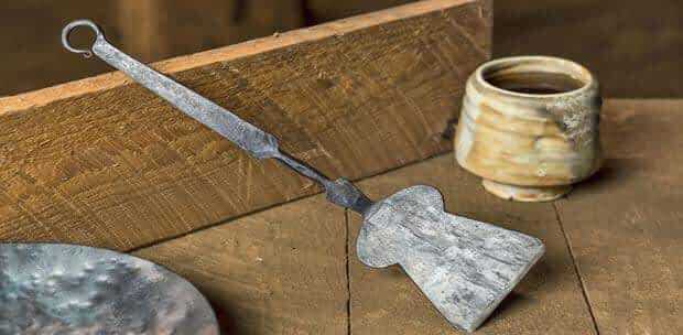 使用成型工具隔离出钢条端部的¾英寸,然后将其打圆。将颈部向后锥化3英寸。用横锤敲击端部形成椭圆形,其宽边与手柄轴垂直。继续弯曲椭圆形端部以适应碗的曲线。