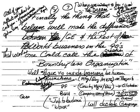 现在让我把这种思维——这种”战略不是一个冗长的行动计划,而是一个核心理念在不断变化的环境中的演进”的理念——与通用电气公司的管理联系起来。