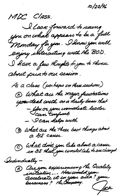 如果可以的话,此刻我应该从口袋里掏出一个密封的信封,里面装着通用电气公司未来十年的宏伟战略。但我做不到,而且我也不打算为了追求理论上的整洁,把通用电气众多不同的举措用一个蝴蝶结包装起来——这些举措包括:为新塑料工厂拨款15亿美元——收购像Calma这样的CAD/CAM供应商——在过去四个月收购了四家软件公司——为机车工厂的生产力升级和产能扩张投入3亿美元——在斯克内克塔迪研究中心建立新的微电子实验室——在罗利/达勒姆投资建设微电子应用中心,以及在弗吉尼亚州夏洛茨维尔建立新的工厂自动化实验室。