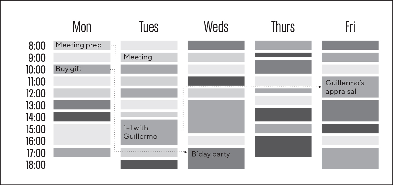 但它仍然远非完美。我必须强制让电子表格与现有承诺(如会议)相配合。同事们无法访问文件(这是2000年代初,在Dropbox和Google Drive出现之前),我当然无法邀请某人查看特定单个项目背后的详细信息。最重要的是,电子表格中的任务与一天中的时间没有关系,需要大量的操作和管理:在任何给定时刻,都不清楚我应该做什么;也不清楚我是否在正轨上或落后了。