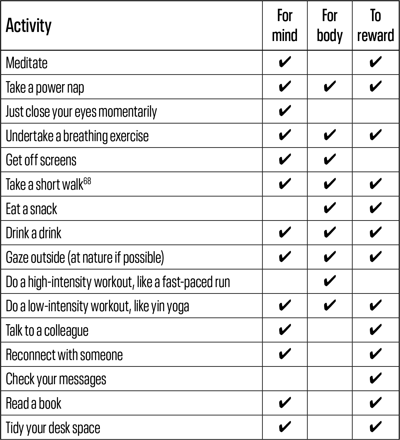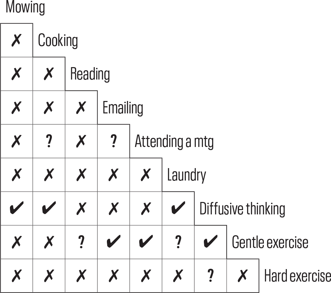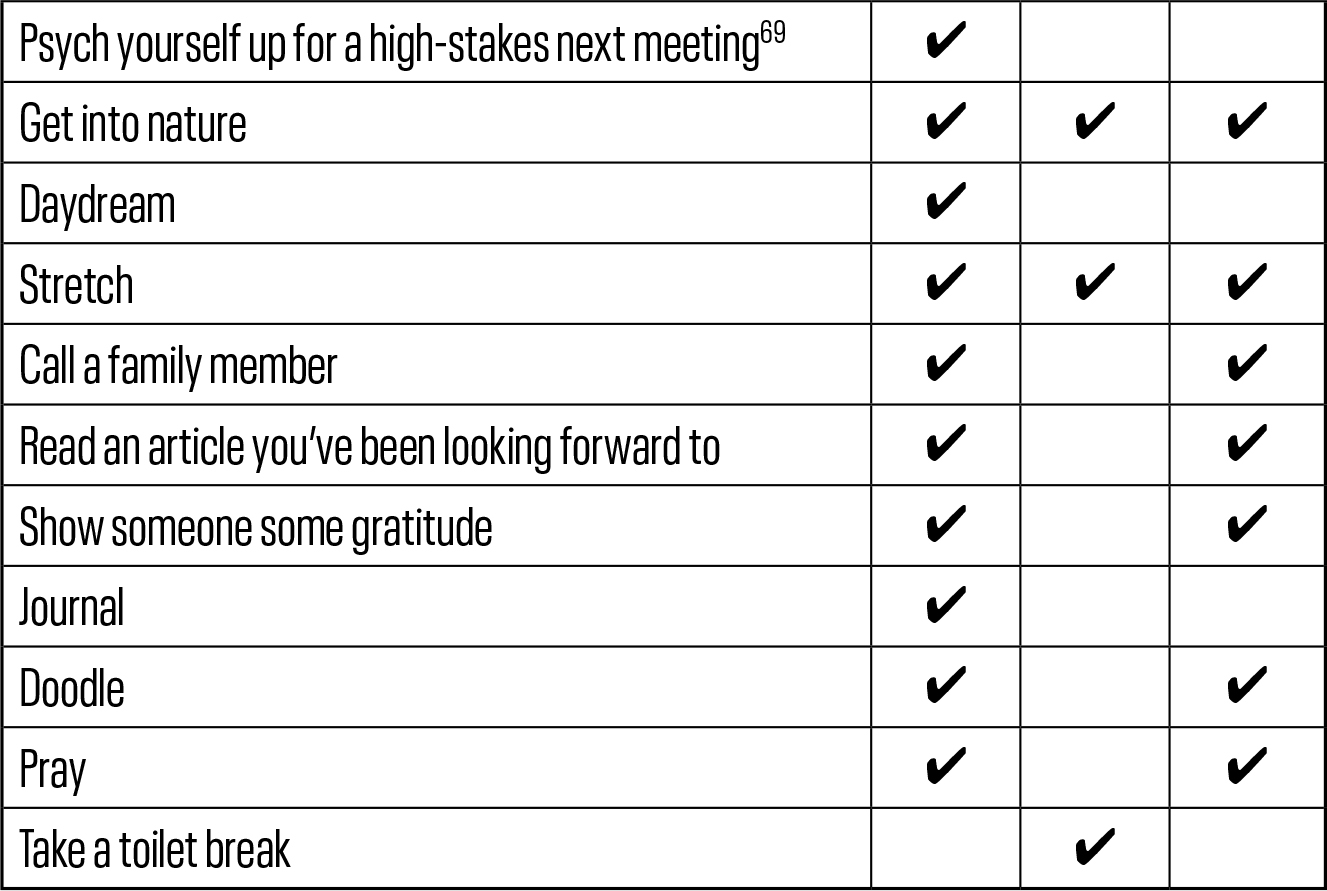 “时间盒(Timeboxing)是一种简单而有效的实践方法,可以通过将我们称之为总体心理状态(SoM)与相应活动保持一致来优化认知表现。通过为特定任务分配固定的时间段(时间盒),我们可以有意识地将任务与正确的心理状态相匹配,从而减少阻力,提高轻松度和生产力。例如,假设我们需要为销售演示进行头脑风暴。如果我们认识到这项任务涉及创造力、深度思考、开放心态和协作,我们就可以也应该有所不同且有意识地为此做准备:整理相关信息、消除干扰、提醒自己需要保持开放心态并积极倾听、将批判性思维暂时搁置,并确保情绪积极向上。(情绪与创造力之间的联系令人深思,但现在已得到充分证实。)”