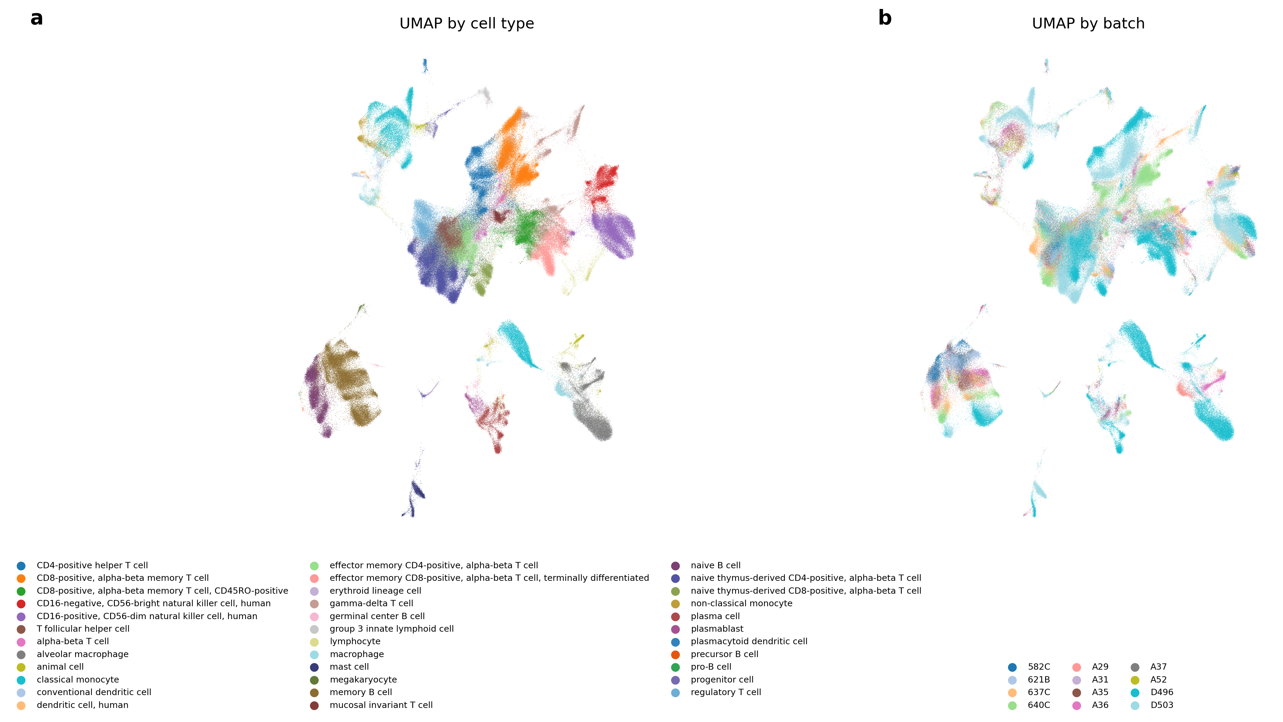 单细胞RNA测序批次整合:通过去除混杂因素,我们可以实现大规模多实验室转录组数据整合,如人类细胞图谱。这是一个困难的问题,因为它需要在高维稀疏数据集中区分微妙的生物信号与噪声。