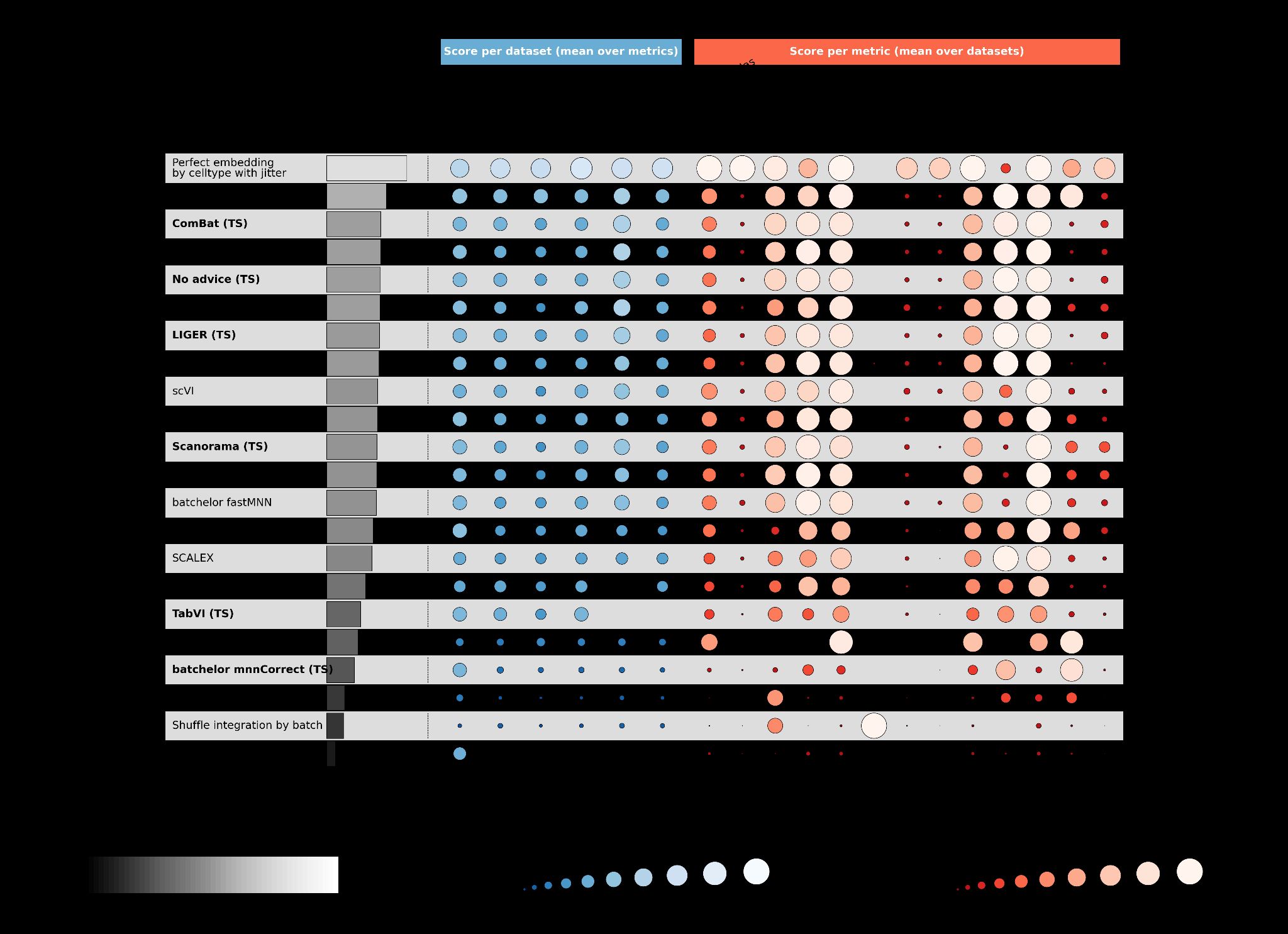 任何批次整合的负控制。总体得分是所有数据集和指标的均值。每个