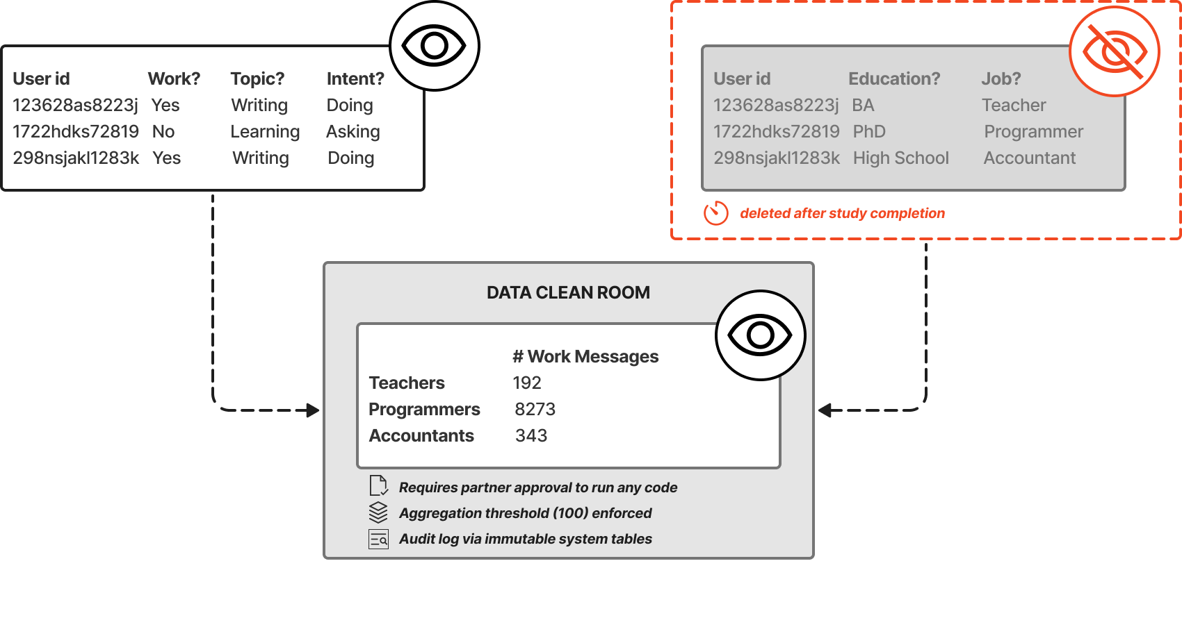 通过数据洁净室保护隐私。 我们从未直接访问用户级人口统计记录。所有就业数据分析都在安全DCR内独家执行,该DCR仅允许对独立持有的数据集进行预先批准的聚合计算;任何一方都无法查看或导出另一方的底层记录。我们使用严格协议管理DCR:要执行任何涉及外部人口统计数据的查询,我们首先从6名共同作者组成的委员会获得明确批准,然后将笔记本提交给我们的数据合作伙伴审批;只有获得批准的笔记本才能在DCR中运行(见图[2])。