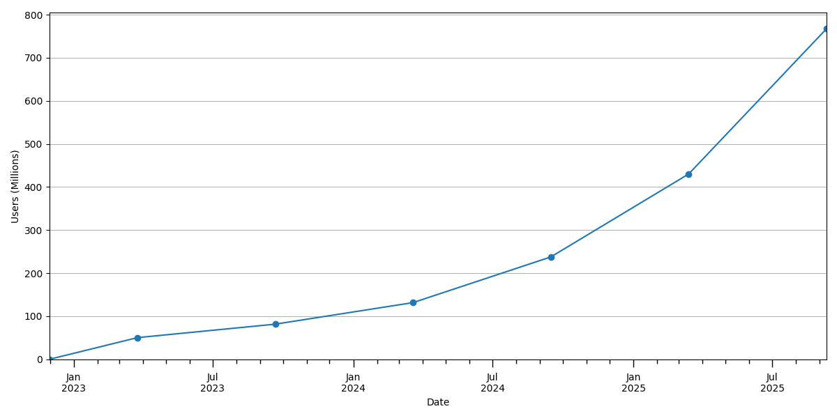 ChatGPT于2022年11月30日作为”研究预览版”向公众发布,到12月5日已有超过一百万注册用户。图[3]报告了消费者计划上总体周活跃用户(WAU)随时间的增长情况。ChatGPT在一年后拥有超过1亿登录WAU,两年后接近3.5亿。到2025年7月底,ChatGPT拥有超过7亿总WAU,接近世界成年人口的10%。[20]