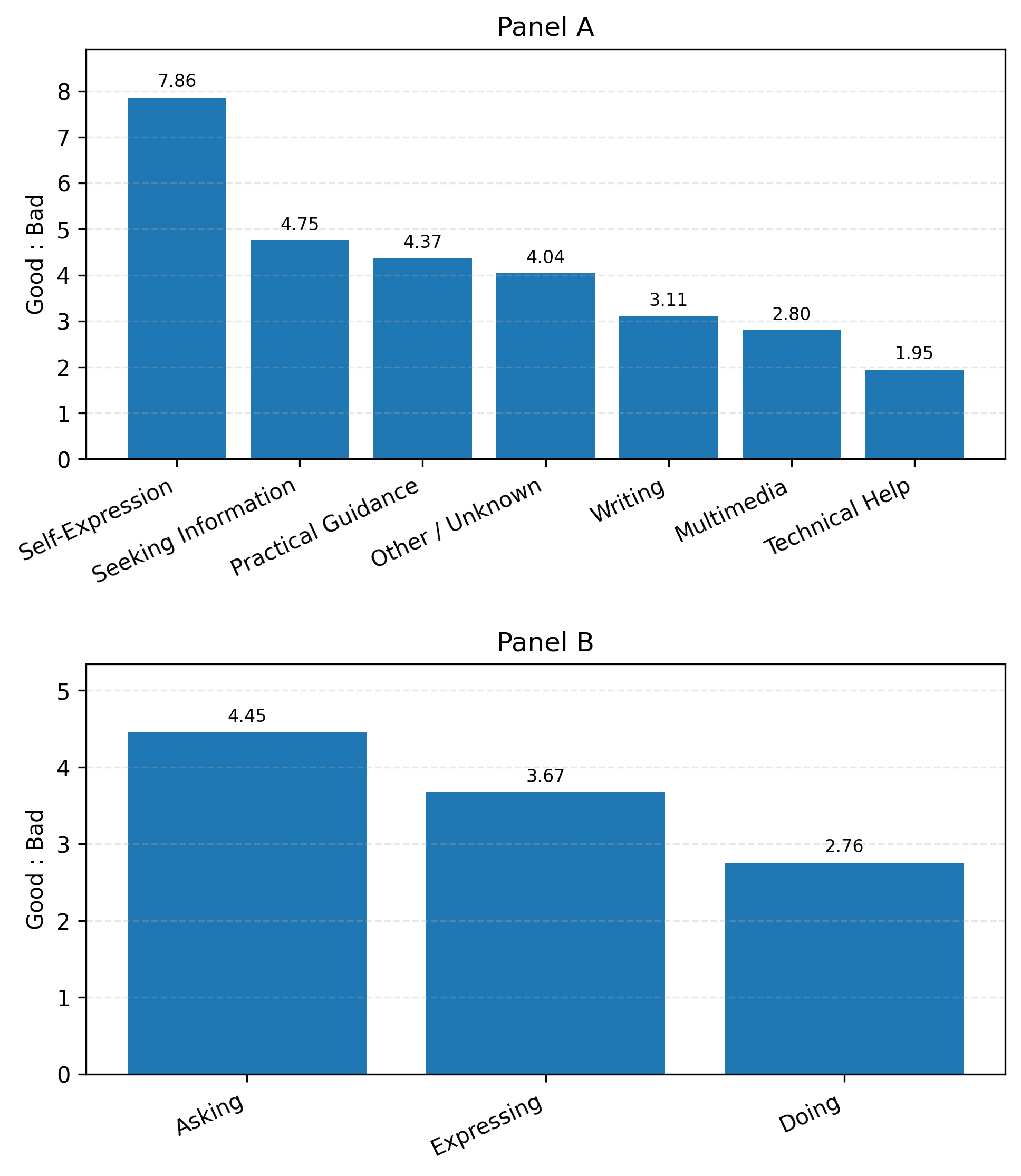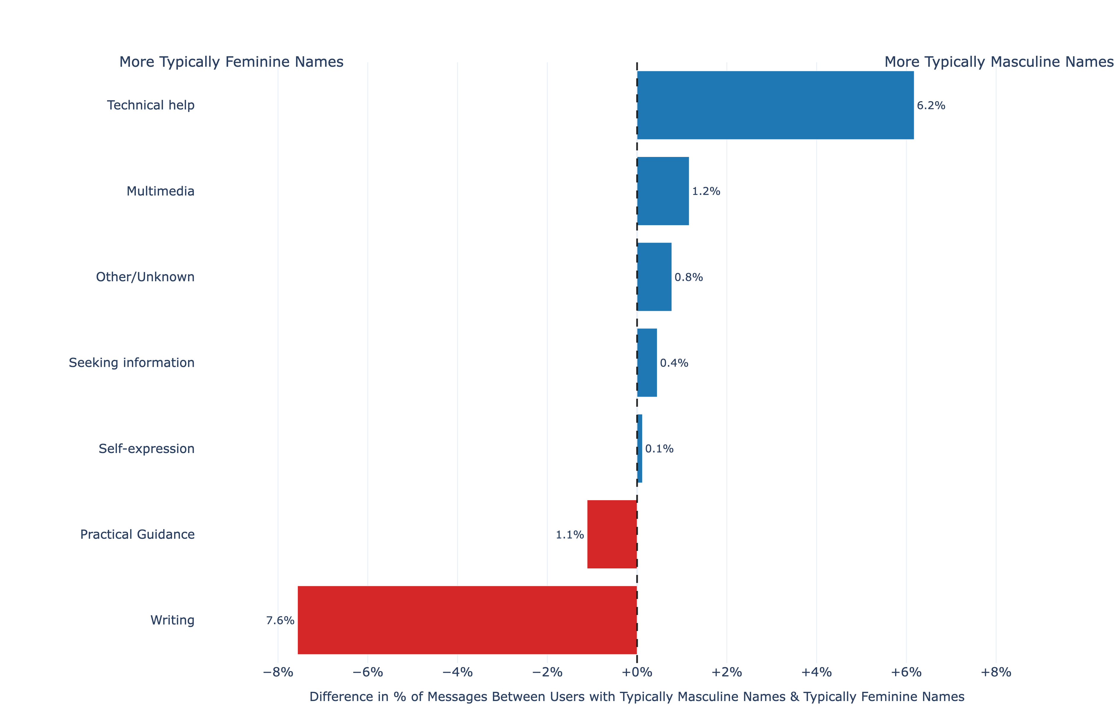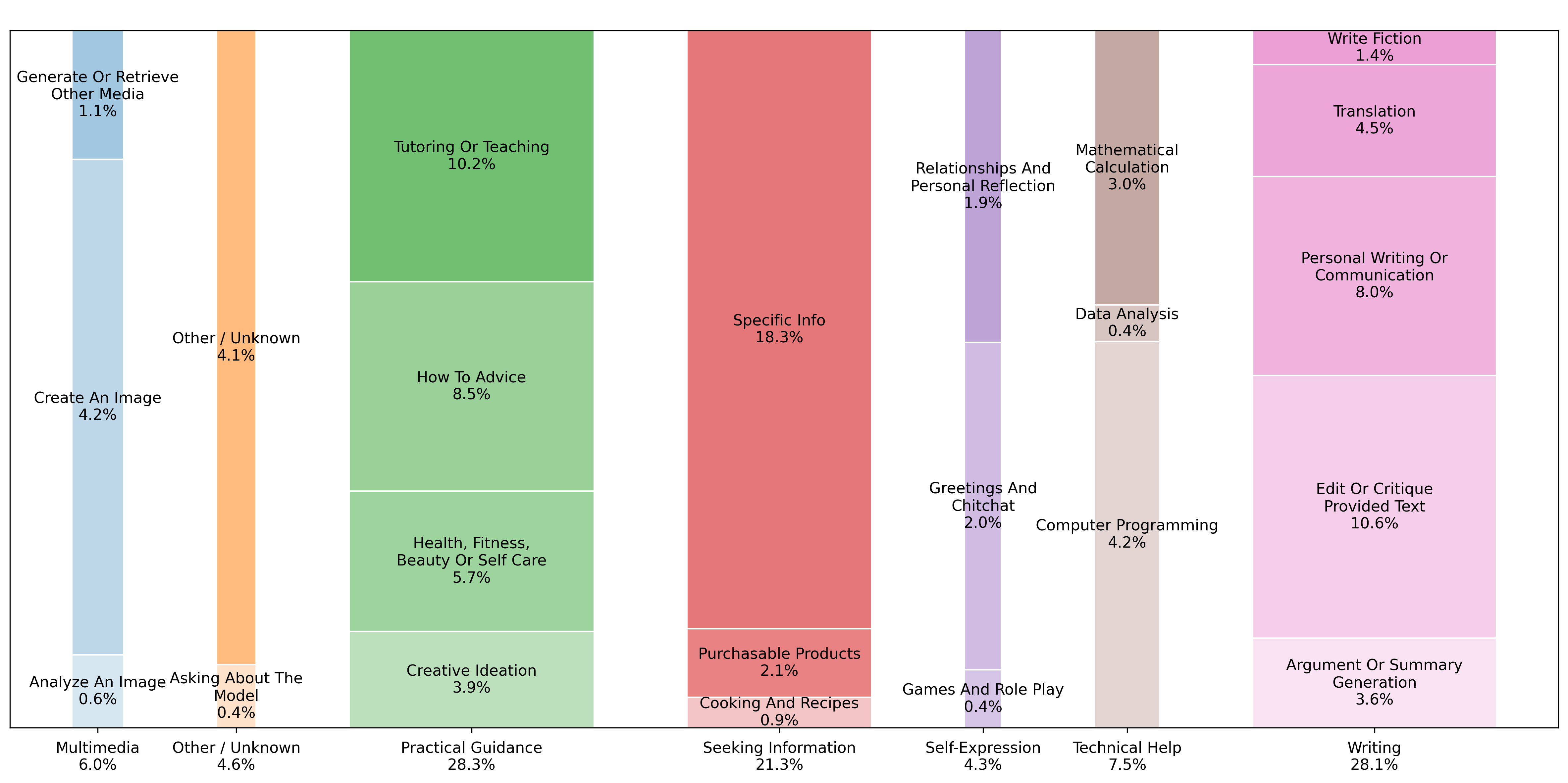 我们的两个发现与其他研究形成对比。首先,我们发现与计算机编程相关的消息份额相对较小:只有4.2%的ChatGPT消息与计算机编程相关,而Claude工作相关对话的这一比例为33% [Handa et al. (2025)]。其次,我们发现与陪伴或社会情感问题相关的消息份额相当小:只有1.9%的ChatGPT消息涉及关系和个人反思主题,0.4%与游戏和角色扮演相关。