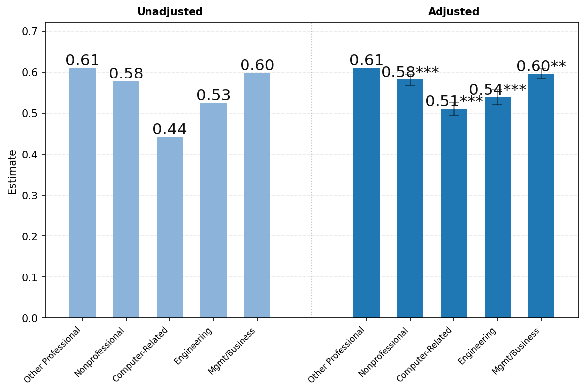 我们基于消费者ChatGPT用户样本的公开可用数据,对聚合就业类别进行了有限分析。该样本包括大约130,000名免费版、增强版和专业版用户,就业类别由供应商通过安全数据洁净室(Data Clean Room, DCR)进行聚合。在此分析中,我们使用与消息级数据集相同的排除标准:我们排除了停用用户、被禁用户、选择退出训练的用户,以及自报年龄低于18岁的用户。由于数据仅适用于用户子集,结果可能不代表完整的用户群体。