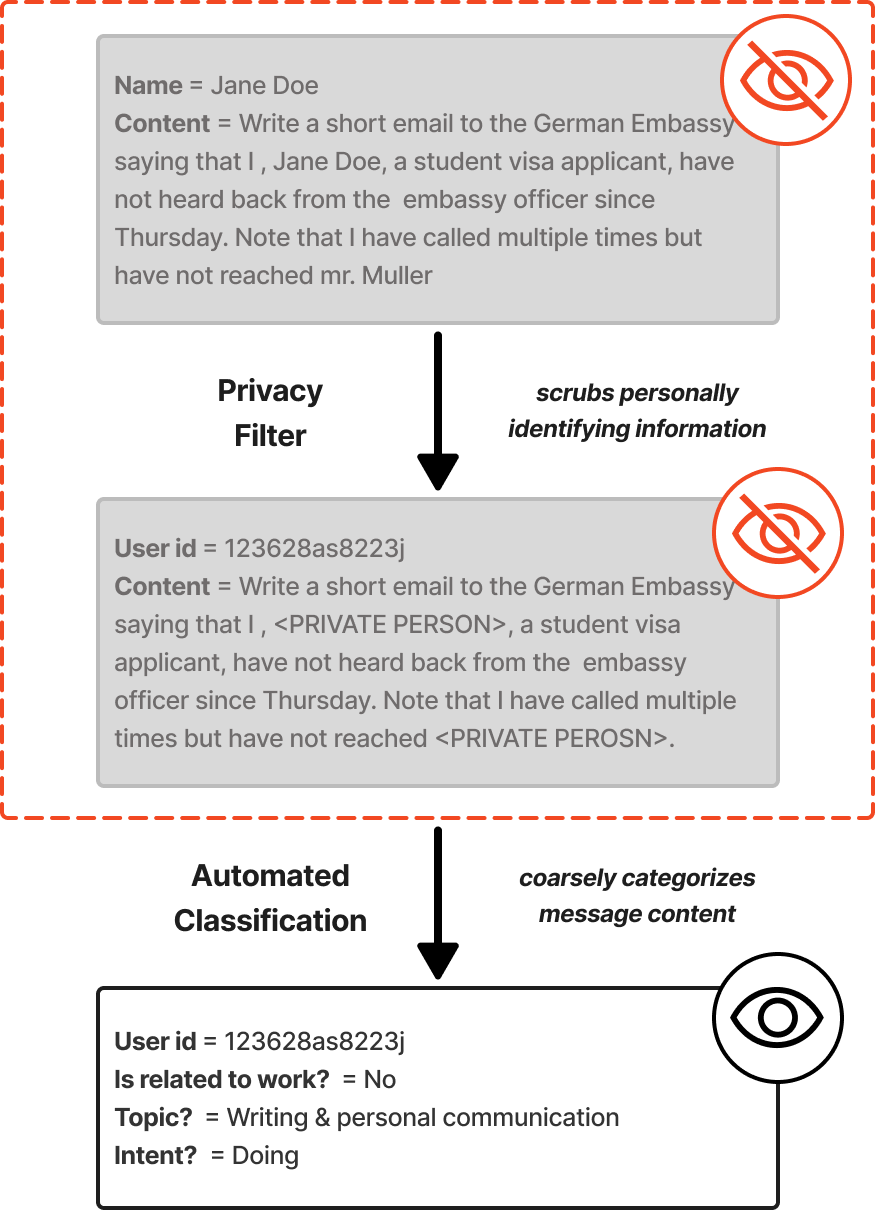 在进行本文分析时,没有人查看消息内容。所有消息内容分析都是通过在去标识化和PII清理后的消息数据上运行的基于LLM的自动化分类器进行的(见图[1])。消息首先通过内部基于LLM的工具清理PII信息[17],然后根据在受控标签空间上定义的分类器进行分类——我们在消息级数据集上使用的最精确分类器是O*NET中级工作活动分类法(Intermediate Work Activities taxonomy),我们将其扩展到333个类别。我们引入了技术和程序障碍来防止意外访问底层文本(例如,不向研究人员呈现消息文本的界面)。