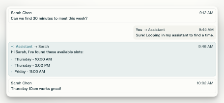 会议安排器搜索参与者的可用时间,提出时间段建议,并直接从邮件对话中发送日历邀请,无需在应用程序之间切换。