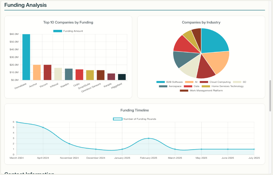 寻找25家在过去12个月内完成A轮融资并正在招聘销售人员的B2B SaaS公司。创建一个包含公司名称、融资金额和联系邮箱的仪表板。然后制作一个可使用的冷邮件外联模板