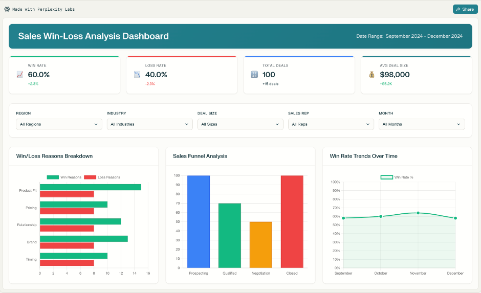 提示:”创建一个交互式销售成交得失分析仪表板,突出显示成交和失败的关键原因。仪表板应包括: